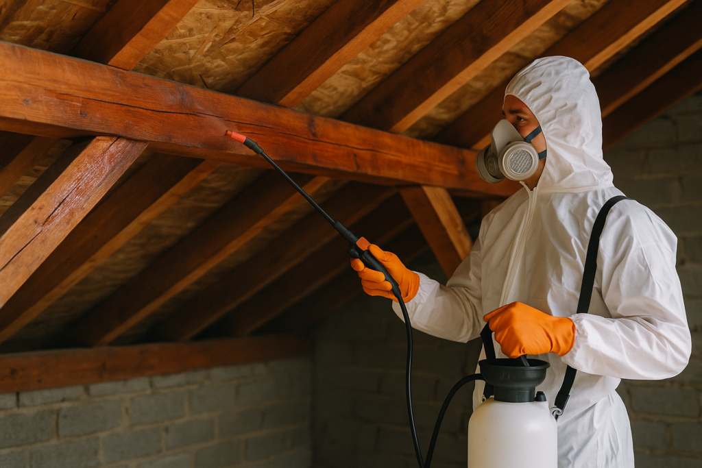 Nous réalisons le traitement de charpente en bois, préventif ou curatif, contre les insectes xylophages (capricornes, vrillettes, termites) et les champignons lignivores. L’intervention comprend le diagnostic, le brossage ou perçage si nécessaire, puis l’injection et la pulvérisation de produits professionnels afin d’assurer une protection durable de la structure et préserver la solidité de l’ouvrage.